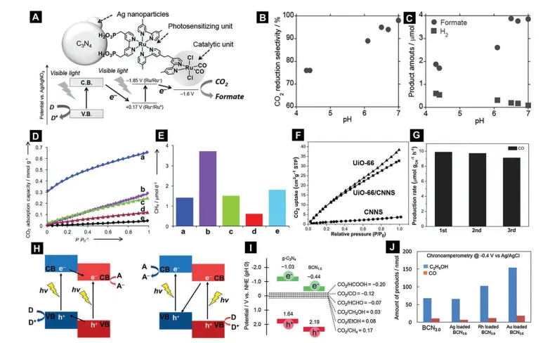Schematic CO2 photoreduction to formate using a hybrid catalyst containing Ag-loaded C3N4 and RuII binuclear complex (RuRu′)